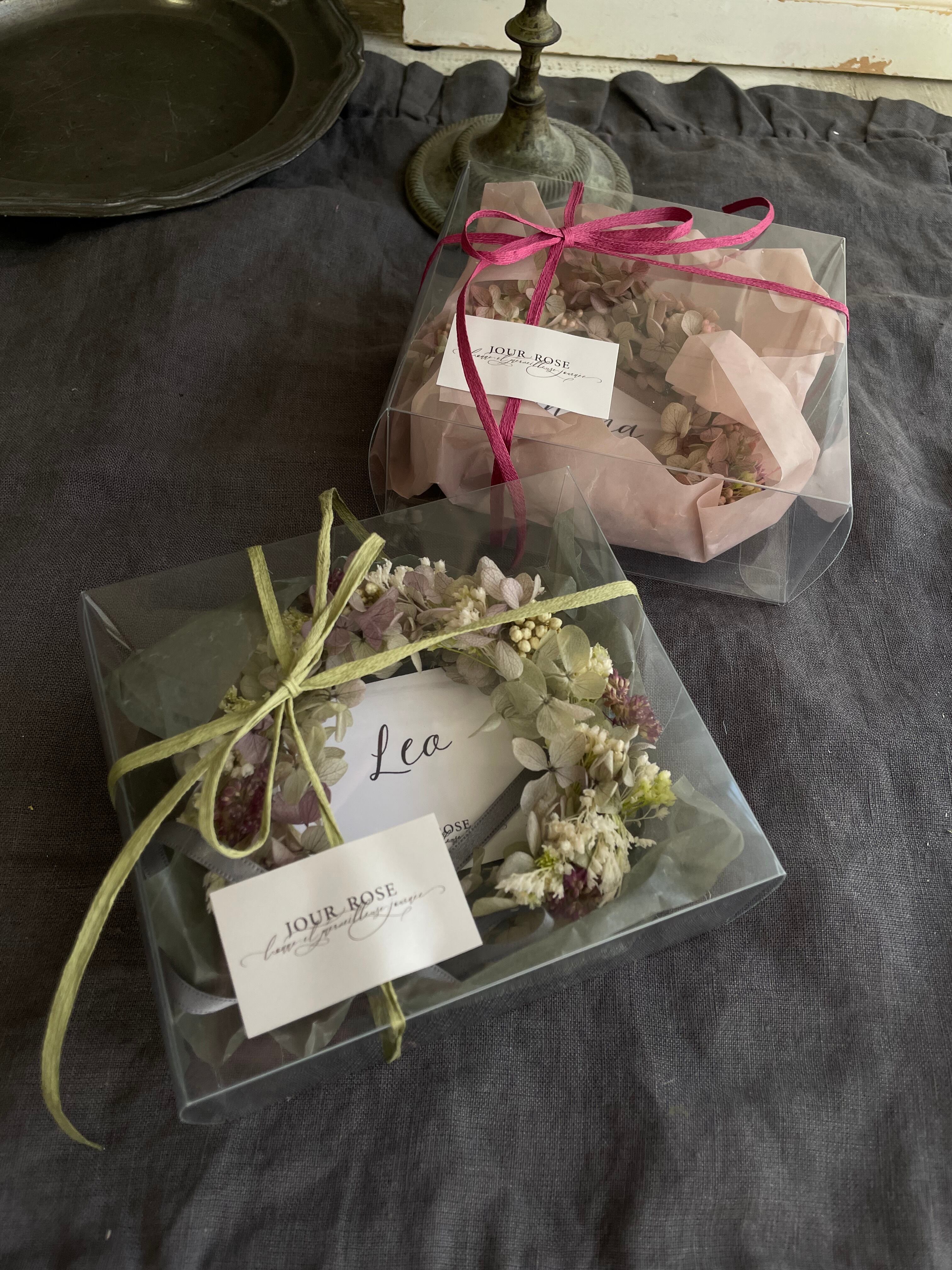 すべて透明ボックスにお入れしてリボンをおかけしますので