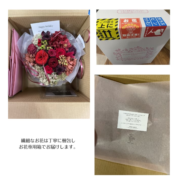 バラ、カーネーション、紫陽花、カスミソウ、ライスフラワー、(すべてプリザーブドフラワー)