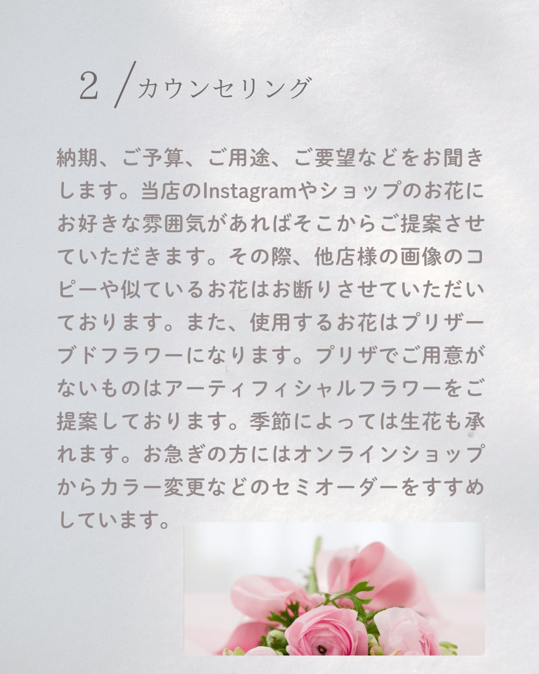 こちらに掲載中のお花のお色の変更やボリュームアップ、また、完全オーダーメイドなどについてご検討の方はお読みください♪